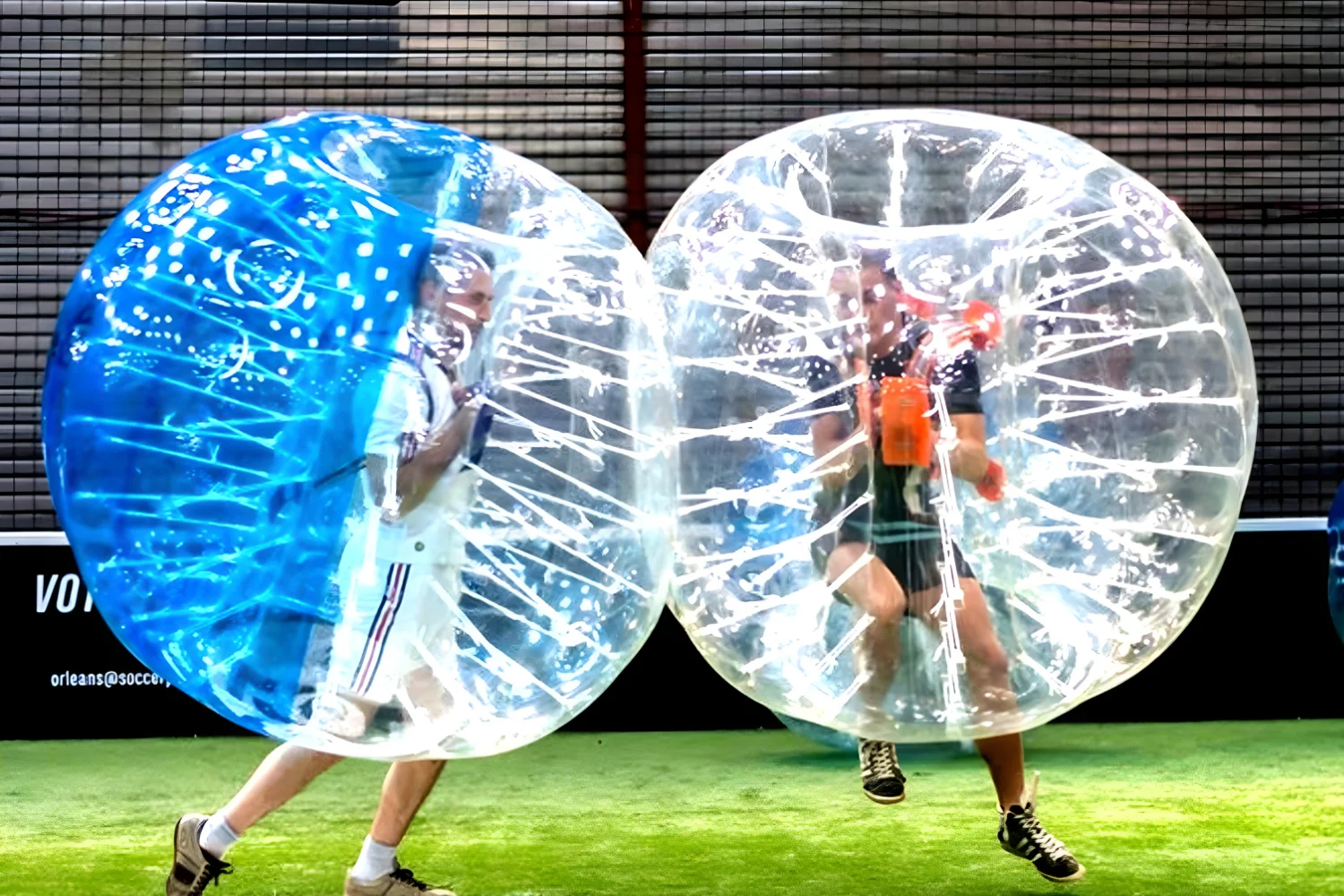 Prenez un match de foot, ajoutez des bulles géantes, secouez bien… et vous obtenez le Bubble Foot. Chaque jour enfile une bulle gonflable transparente qui recouvre le haut du corps et doit essayer de marquer un but. C’est physique, drôle, absurde, et parfait pour se défouler quand il pleut.